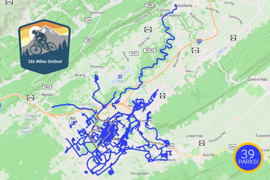 Take a trip from Innovation Park to Bellefonte! A mix of pavement, gravel, and dirt! Plenty of fishing, hikers, and sometimes horses!